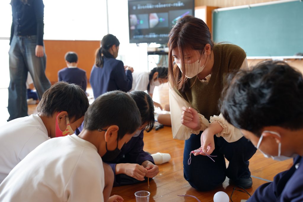 また、当日は情報工学科4年生の廣瀬由依さんと都市環境デザイン工学科4年生の長山楓さんも講師として参加し、「光の万華鏡」や「紫外線ビーズ」の工作、「紫外線の測定」など、子どもたちと楽しくふれあいながら活動を行いました。