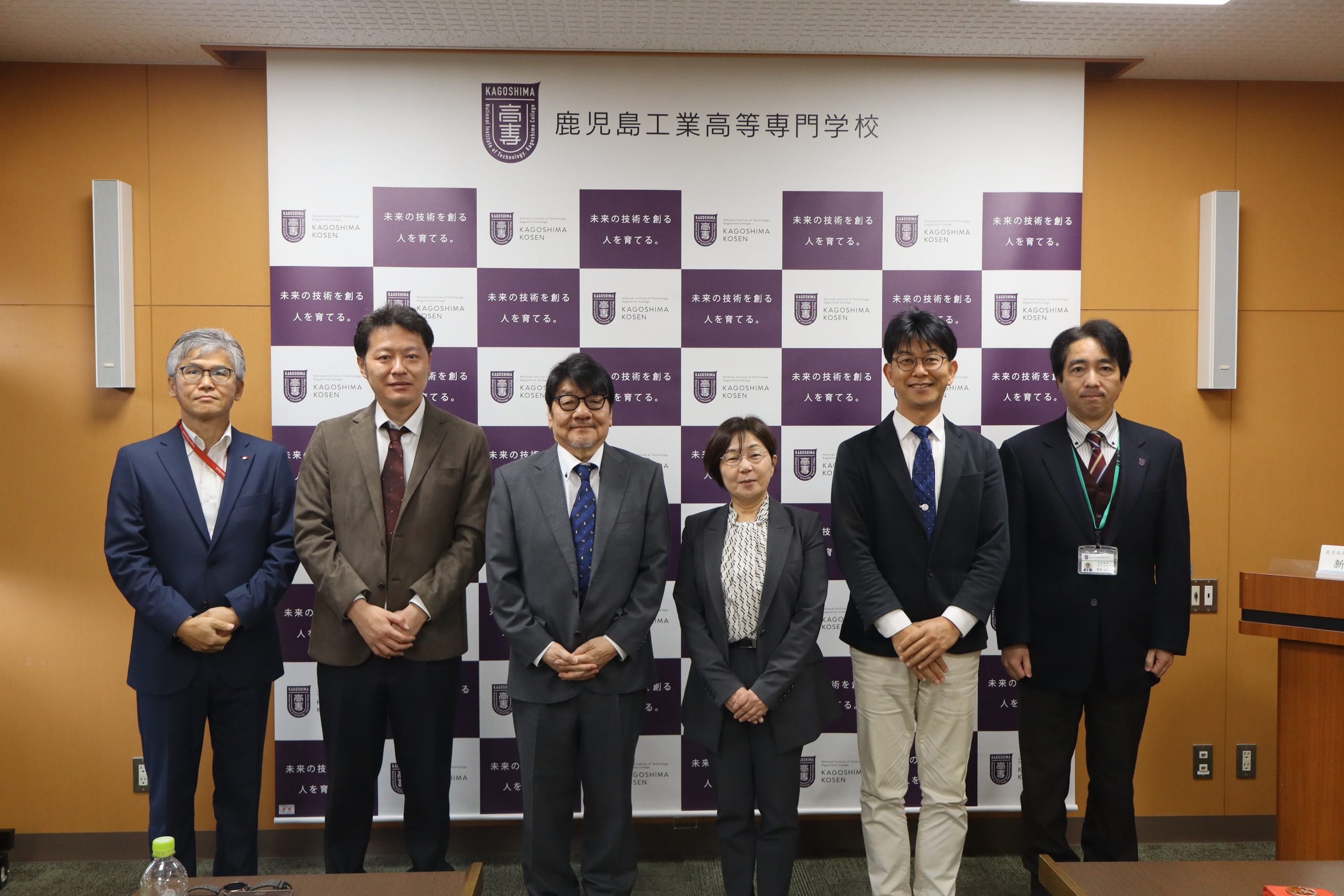 (左から竹元支店長、油田哲平常務取締役、油田知裕社長、上田校長、逆瀬川教授、原田総務課長)
