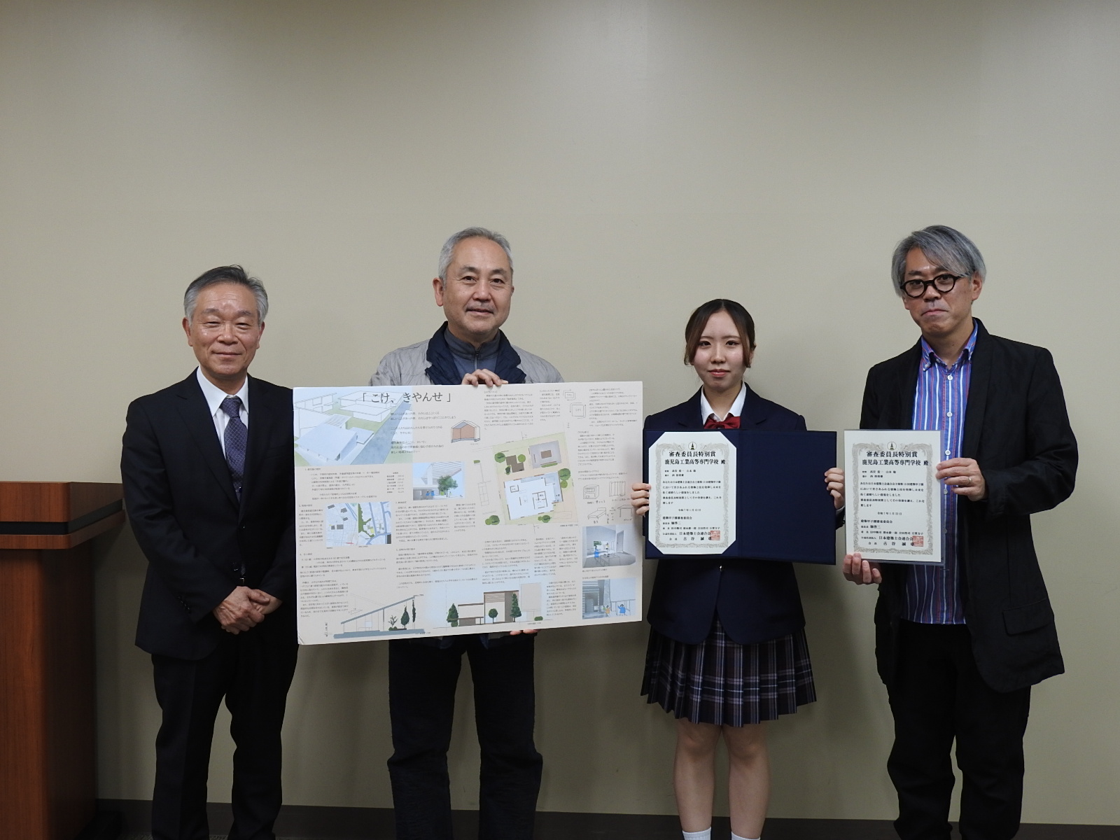 第15回高校生の建築甲子園で審査委員長特別賞を受賞しました student-successes 鹿児島工業高等専門学校 > 学生の活躍 > 第15回高校生の建築甲子園で審査委員長特別賞を受賞しました 2025年02月12日 第15回高校生の「建築甲子園」において、鹿児島県代表として参加した都市環境デザイン工学科3年西裕莉愛さんの作品が審査委員長特別賞を受賞しました。 受賞に伴い、公益財団法人鹿児島県建築士会会長の西薗幸弘様より表彰状の授与を受けました。 西さんは昨年の高校生向け建築設計競技応募プロジェクトにも参加し、他にも自主的にコンペに参加していますが、すべてのコンペで入賞を果たし、今回で四つ目の入賞となりました。 今後のさらなる活躍が期待されます。