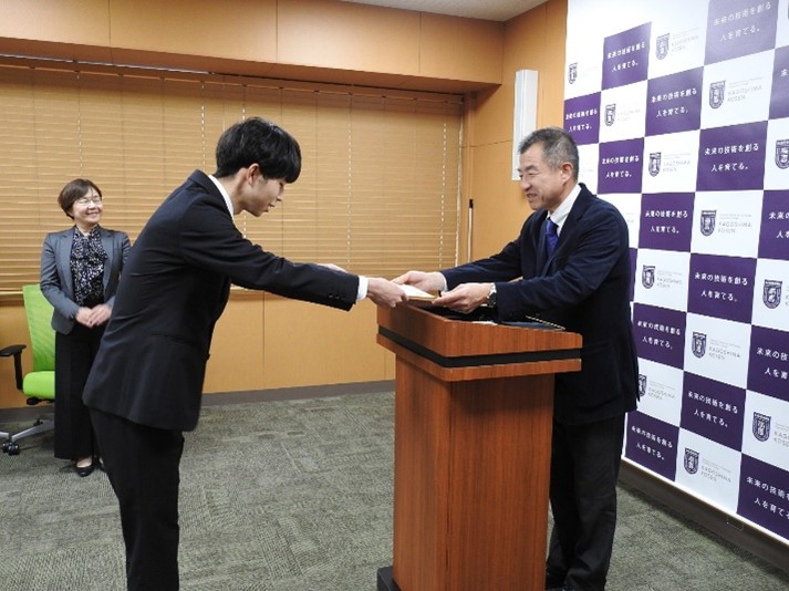 第1回みどり戦略学生チャレンジ九州ブロック大会 九州農政局長賞の授与式を実施しました! student-successes 鹿児島工業高等専門学校 > 学生の活躍 > 第1回みどり戦略学生チャレンジ九州ブロック大会 九州農政局長賞の授与式を実施しました! 2025年03月13日 令和7年3月3日(月)に第1回みどり戦略学生チャレンジ九州ブロック大会九州農政局長賞の授与式を執り行われ、 宮原 愼之助さん(建設工学専攻1年)に表彰状が授与されました。 宮原さんは、農林水産省主催の第1回みどり戦略学生チャレンジ九州ブロック大会に主代表者として参加し、大学・専門学校の部において、「果樹剪定枝を用いたきのこ栽培技術の開発」に関する研究で「九州農政局長賞」を受賞しました。 今後の益々の活躍を期待しています!